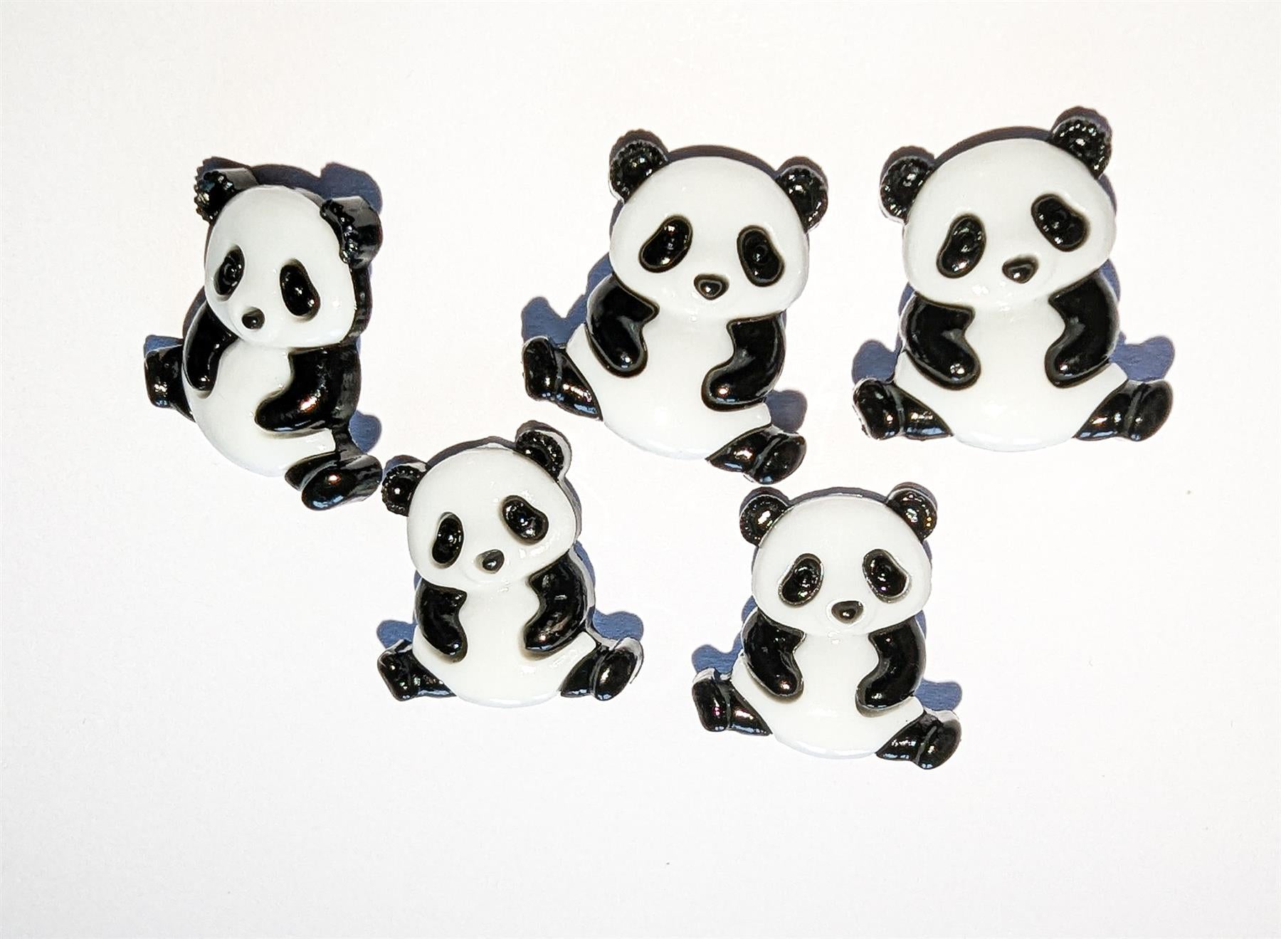 Pack of 5 large panda buttons. Each button is 23mm wide and 18mm tall. The buttons have a shank on the back to affix them